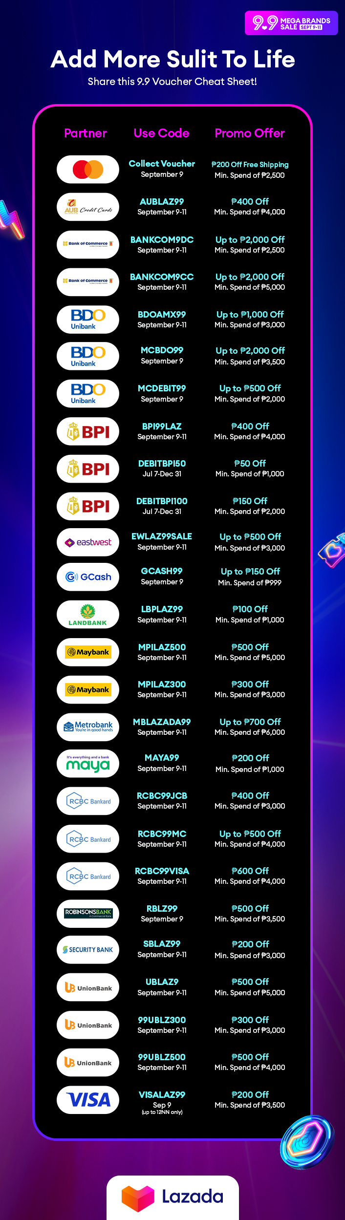 Aside from the massive assortment of deals, Lazada also has a line-up of partner promotions you can look forward to this 9.9.