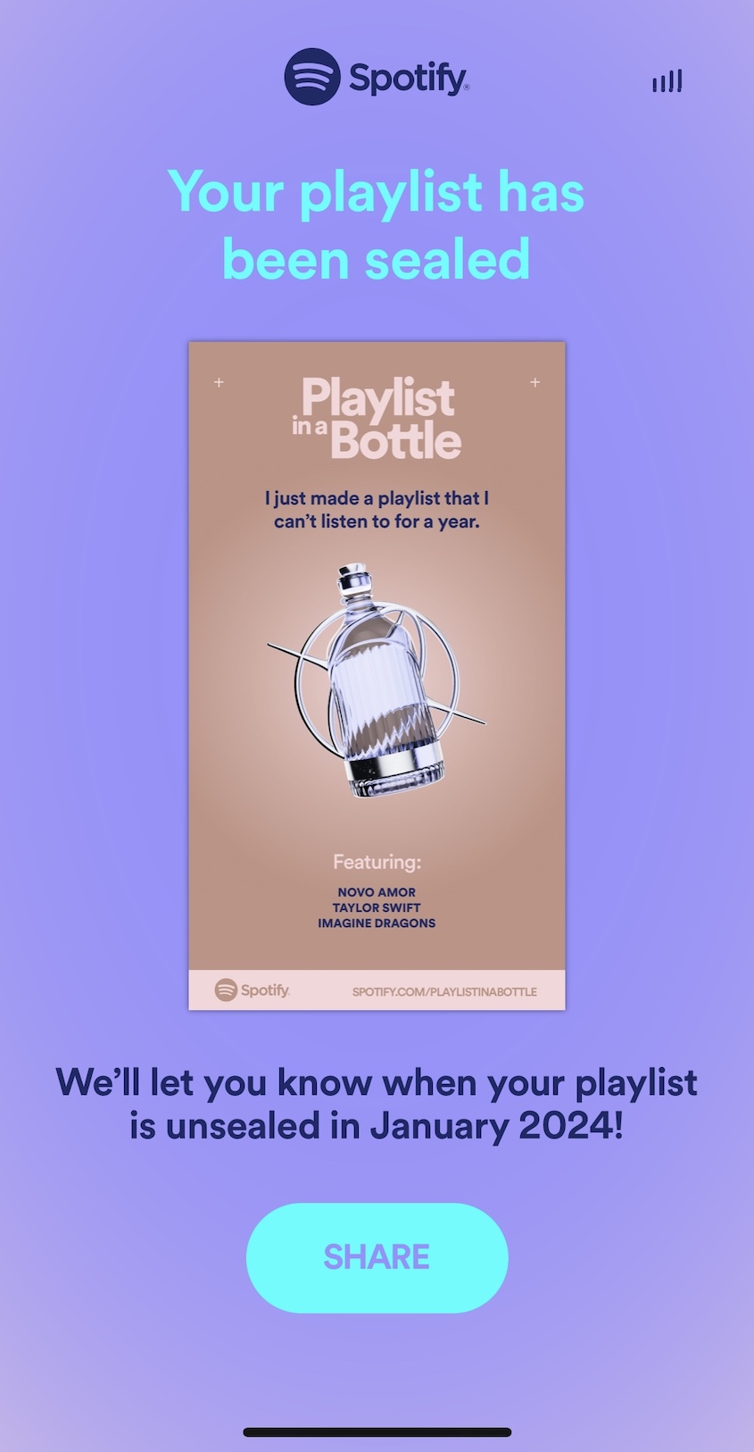 6. Come January 2024, if you made a Playlist in a Bottle, you’ll receive your personalized time capsule reminding you what you were listening to one year prior.